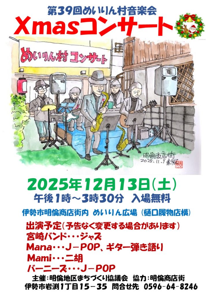めいりん村音楽会「Xmasコンサート」の開催です。みなさまのご来場をお待ちしています。